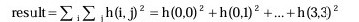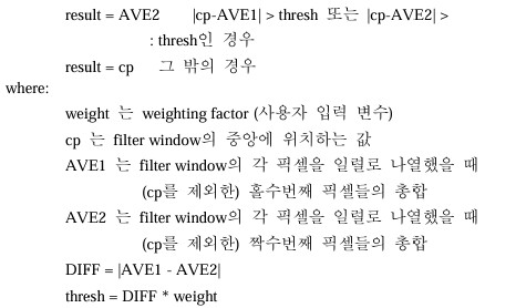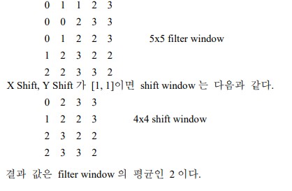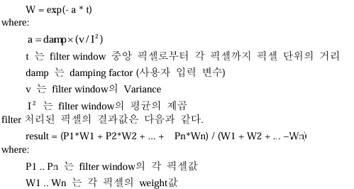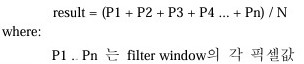 결과값은 filter window의 픽셀 값들을 이용하여 다음의 식을 통해 계산된다. ![]() ![]() |