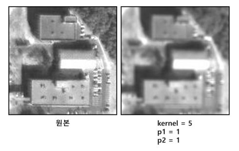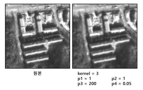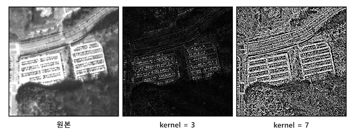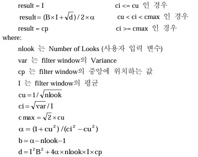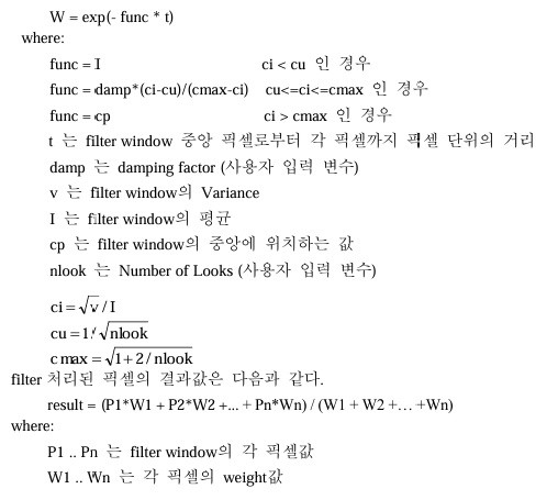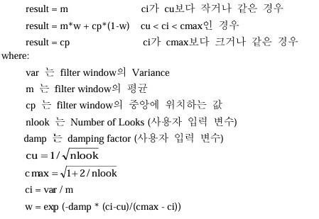 Enhanced Lee Filter는 에지와 같은 고주파의 특징들은 보존하는 반면 고주파 노이즈를 제거하기 위하여 레이더 데이터에 주로 적용된다.