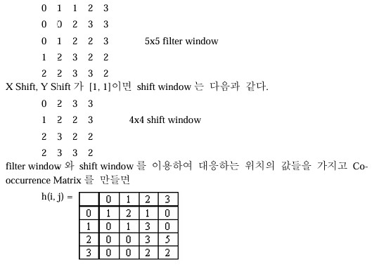 Co-occurrence[Correlation] Filter는 사용자 입력변수 X Shift, Y Shift만큼 filter window를 오른쪽과 아래쪽 방향으로 이동한 shift window를 얻는다. 이 두 window를 통해 Co-occurrence Matrix를 계산하고 이 Matrix를 이용하여 결과값을 얻는다.