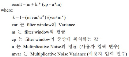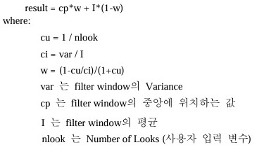 Lee[Multiplicative] Filter는 에지와 같은 고주파의 특징들은 보존하는 반면 고주파 노이즈를 제거하기 위하여 레이더 데이터에 주로 적용된다.