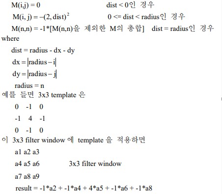 Edge Sharpening Filter는 영상의 고주파 성분을 강조하여 에지를 추출하는 기능을 갖는다. 이 필터는 영상에 Average Filter를 적용한 후 이 영상에 원본 영상을 뺀 결과를 얻는다. ![]() |