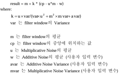Lee[Additive and Multiplicative] Filter는 에지와 같은 고주파의 특징들은 보존하는 반면 고주파 노이즈를 제거하기 위하여 레이더 데이터에 주로 적용된다.