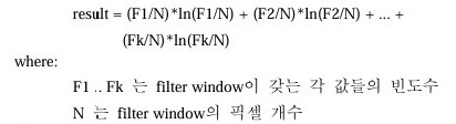 Occurrence[Entropy] Filter는 filter window의 각 픽셀 분포의 entropy를 결과값으로 계산한다.![]() ![]() |