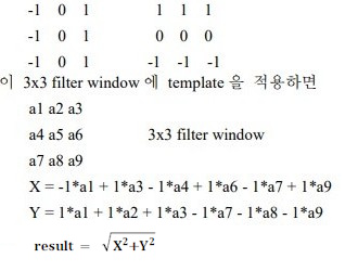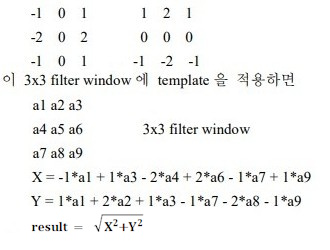 Sobel Edge Detect Filter는 입력 영상의 에지를 강조한다. 이 필터는 Prewitt Edge Detect Filter의 개선형으로 기본적으로 수평, 수직 에지에 민감하다. 이 필터에서 가능한 커널의 크기는 3x3이다. 이 필터가 사용하는 결과값을 계산하기 위한 2 개의 3x3 template 은 다음과 같다. ![]() ![]() |