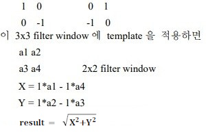 Roberts Edge Detect Filter는 입력 영상의 에지(edge)를 강조한다. 이 필터의 Template는 다른 Edge Detect Filter의 Template보다 간단하지만 효과적이다. 이 필터는 잡음에 민감하며, 가능한 커널의 크기는 2x2이다. 이 필터가 사용하는 결과값을 계산하기 위한 2 개의 2x2 template 은 다음과 같다. ![]() ![]() |