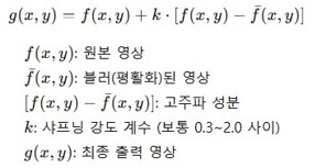 | UnsharpMask | 111 | Unsharp Mask Filter는 High-Pass 영상(원본 영상과 부드러워진 영상(Gaussian Smoothing)의 차이)을 일정비율 곱해서 원본영상에 더하여 계산한다.
